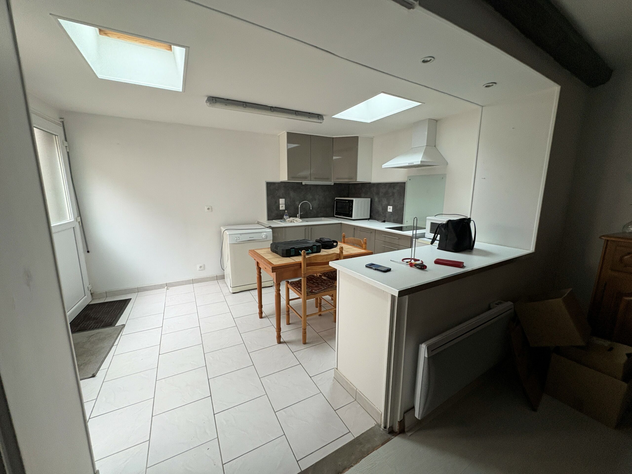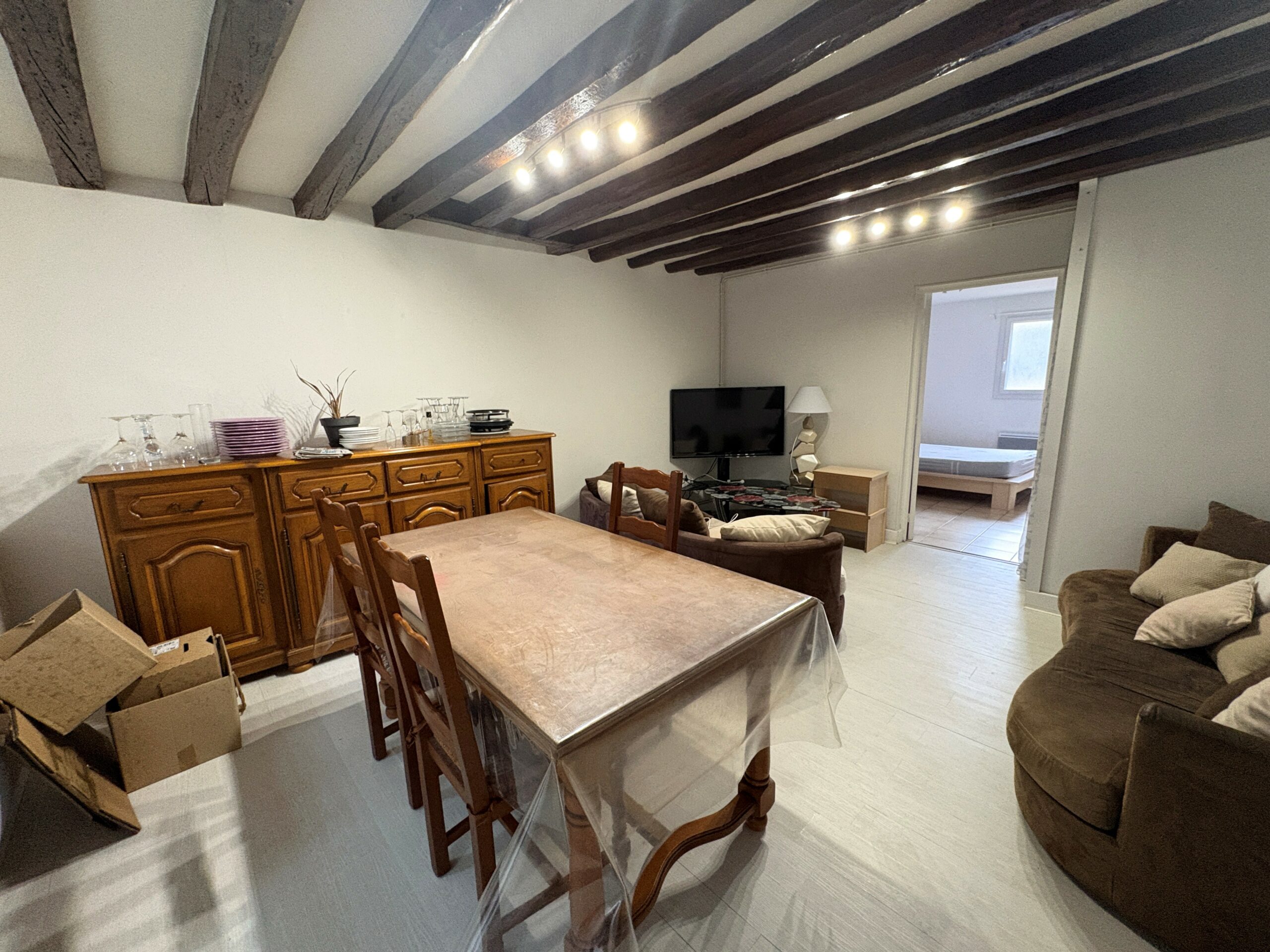 Appartement de plain-pied de 49 m² situé à Le Neubourg comprenant : une cuisine aménagée et partiellement équipée ouverte sur une pièce principale, une salle d’eau avec WC et une chambre.