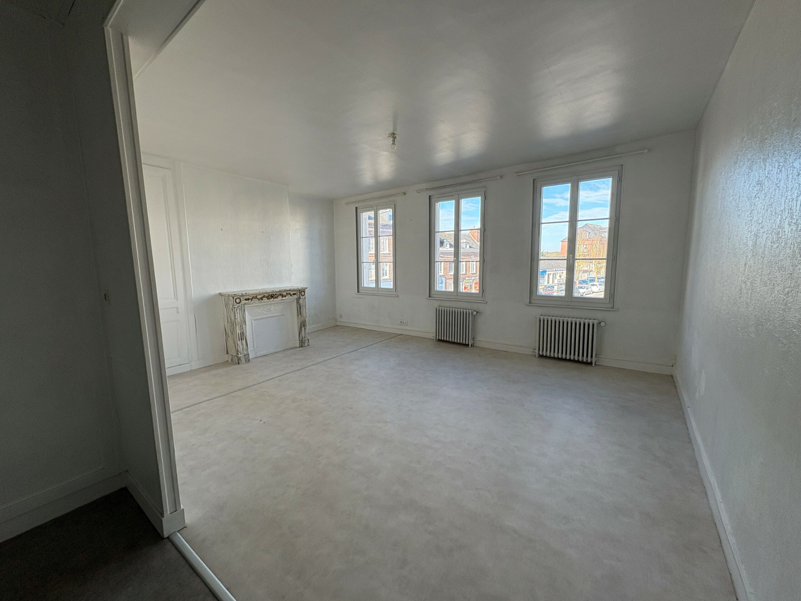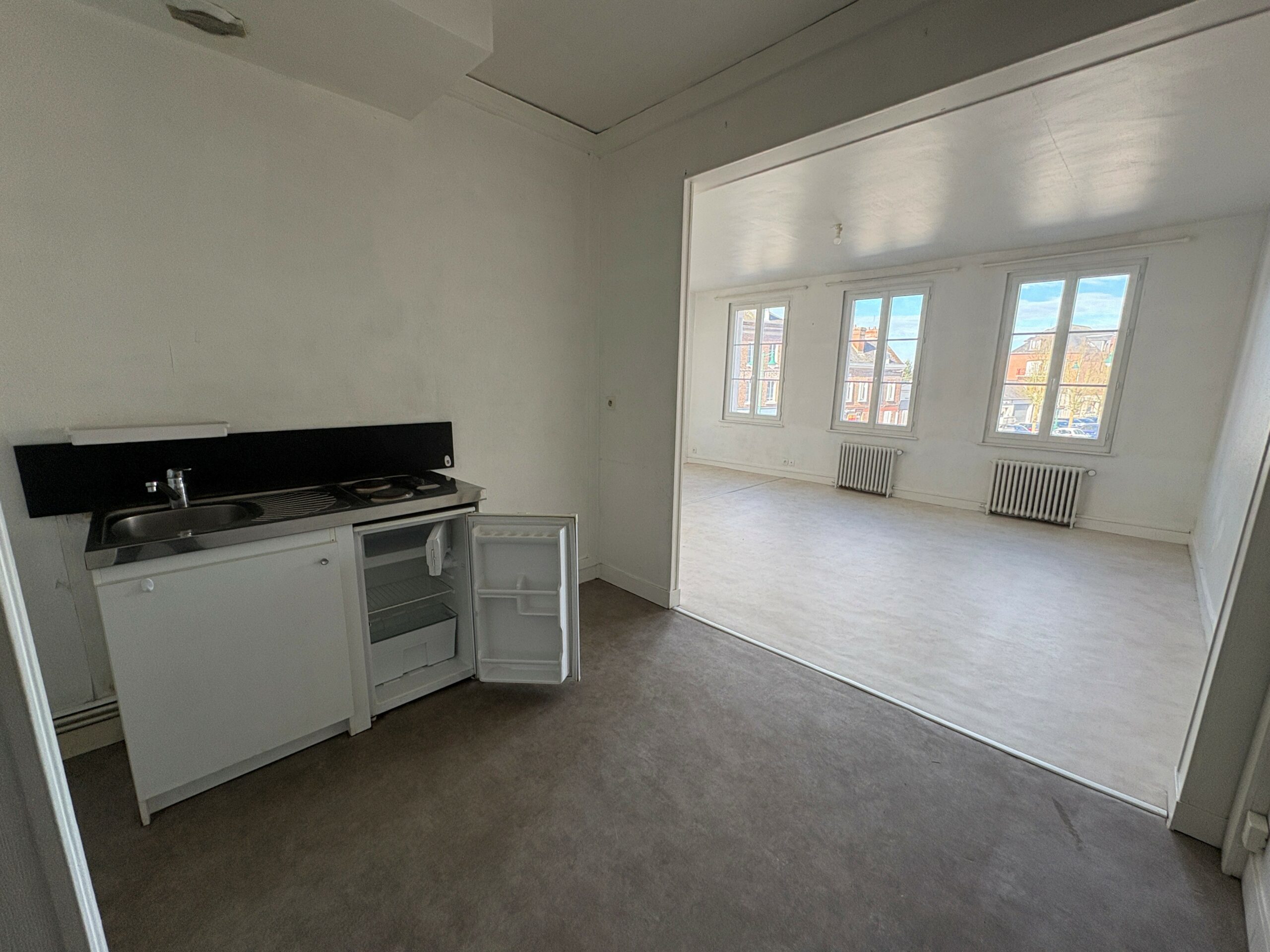 Studio de 43 m² au premier étage situé en résidence sécurisée au Neubourg comprenant : une cuisine ouverte sur une pièce principale avec placard et une salle d’eau avec WC.